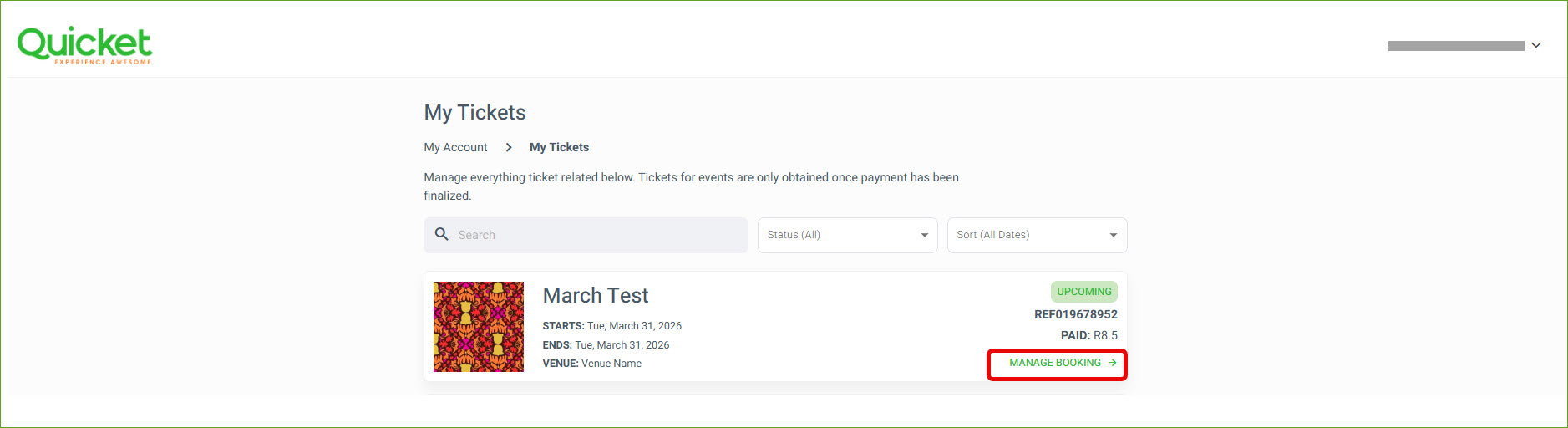 If the Quicket email containing your tickets has not landed in your main mailbox, it may have been directed to another tab. Check your Spam, Promotions or Purchases folders if the email is not in your main inbox.