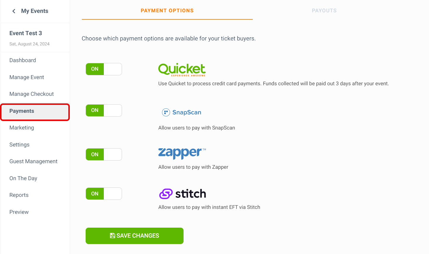 Once your event is created, go to Organiser Hub -> My Events in your Quicket account then click on the name of your event. Navigate to the Payments menu option. Here you'll find a list of your payment options. You can select any combination of these by sliding the toggle to ON.