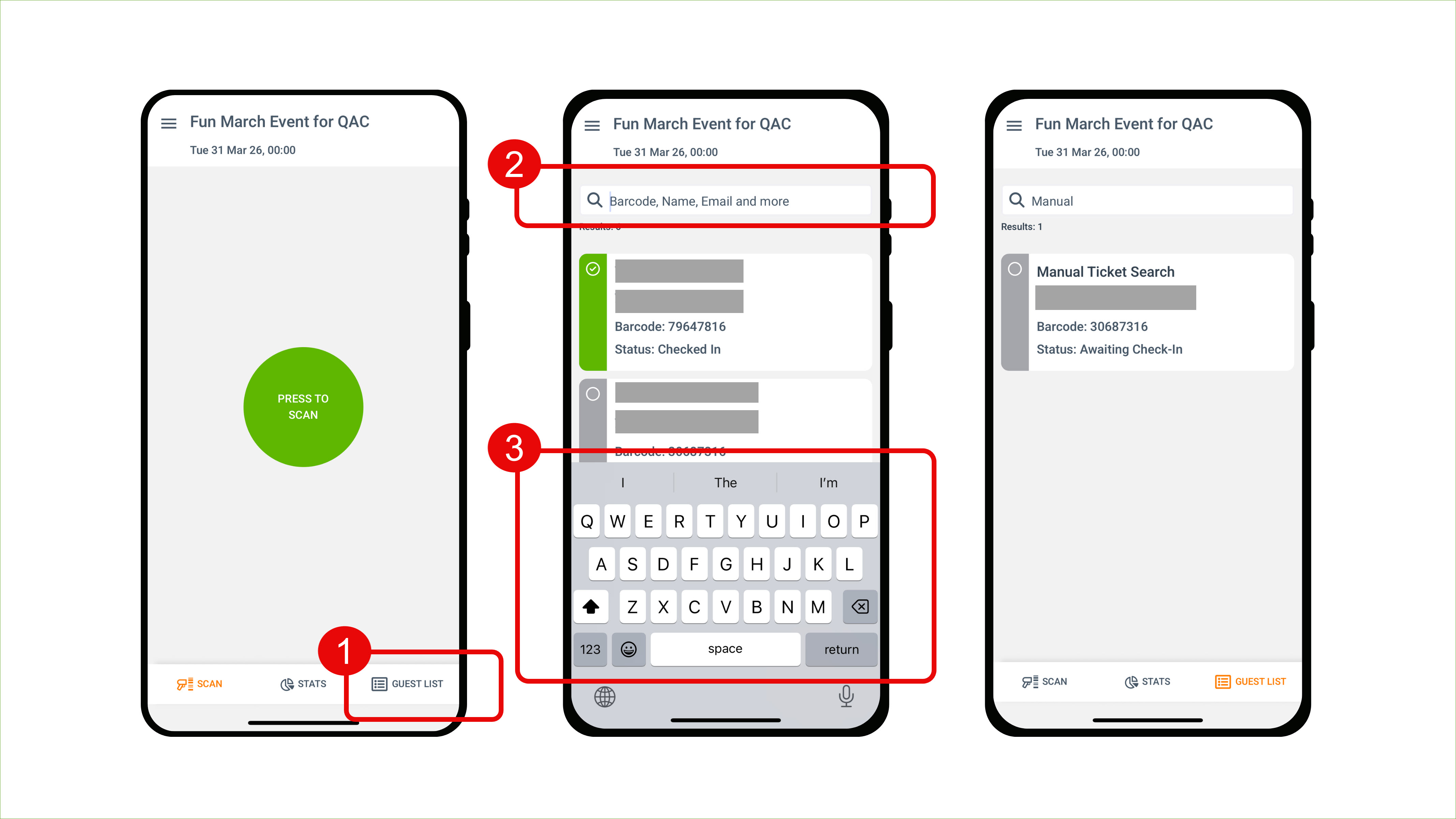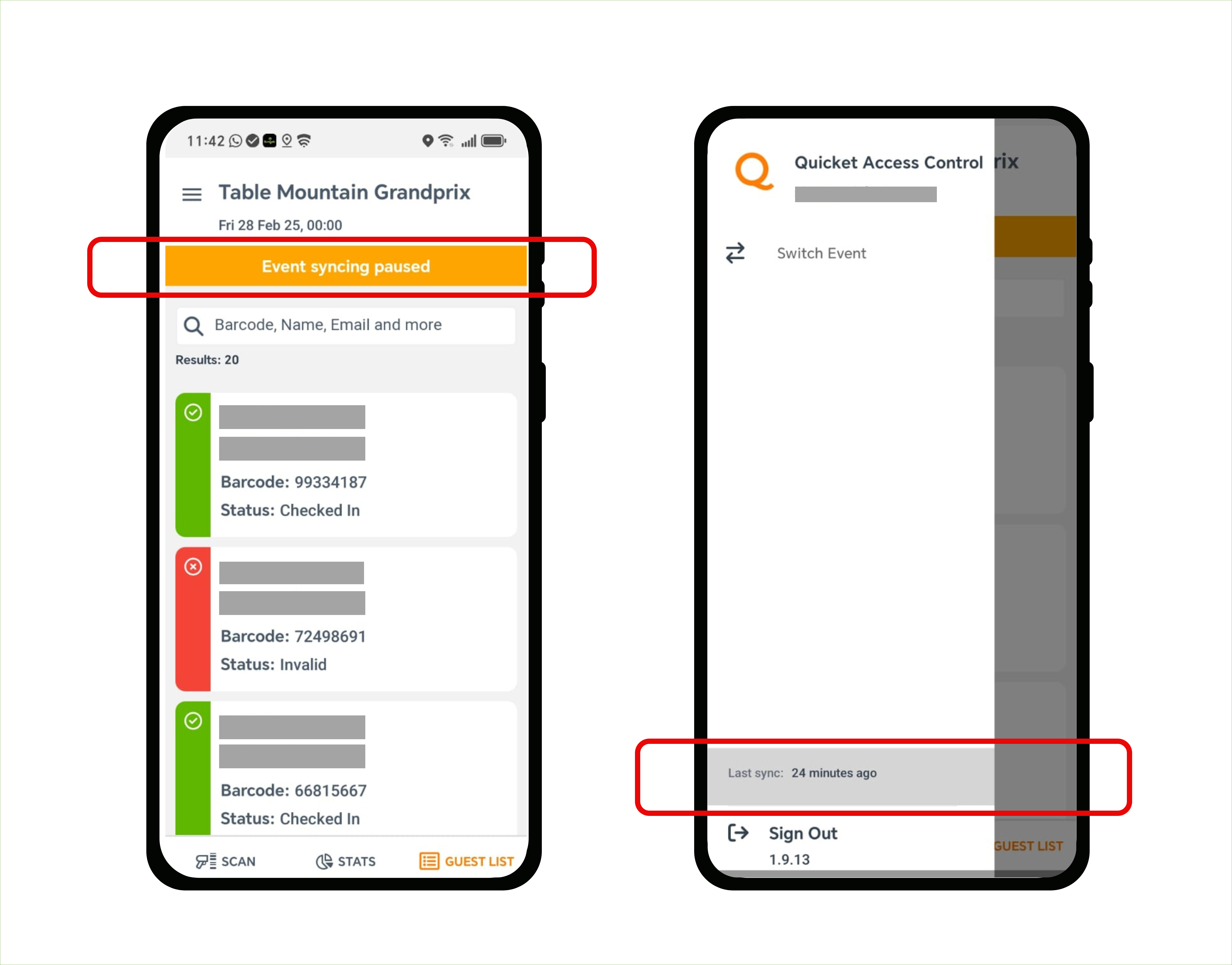 Note: If your phone is offline while scanning, be sure to connect to the internet before logging out your account on the app or switching events in the app. Otherwise, you will lose any check-in data that was collected while scanning.