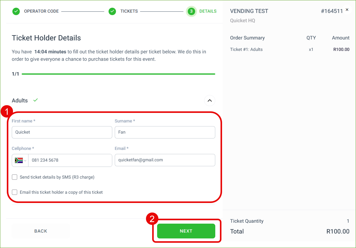 Enter the ticket buyer's details and specify whether they'd like to receive their tickets by SMS or email. Then click Next.